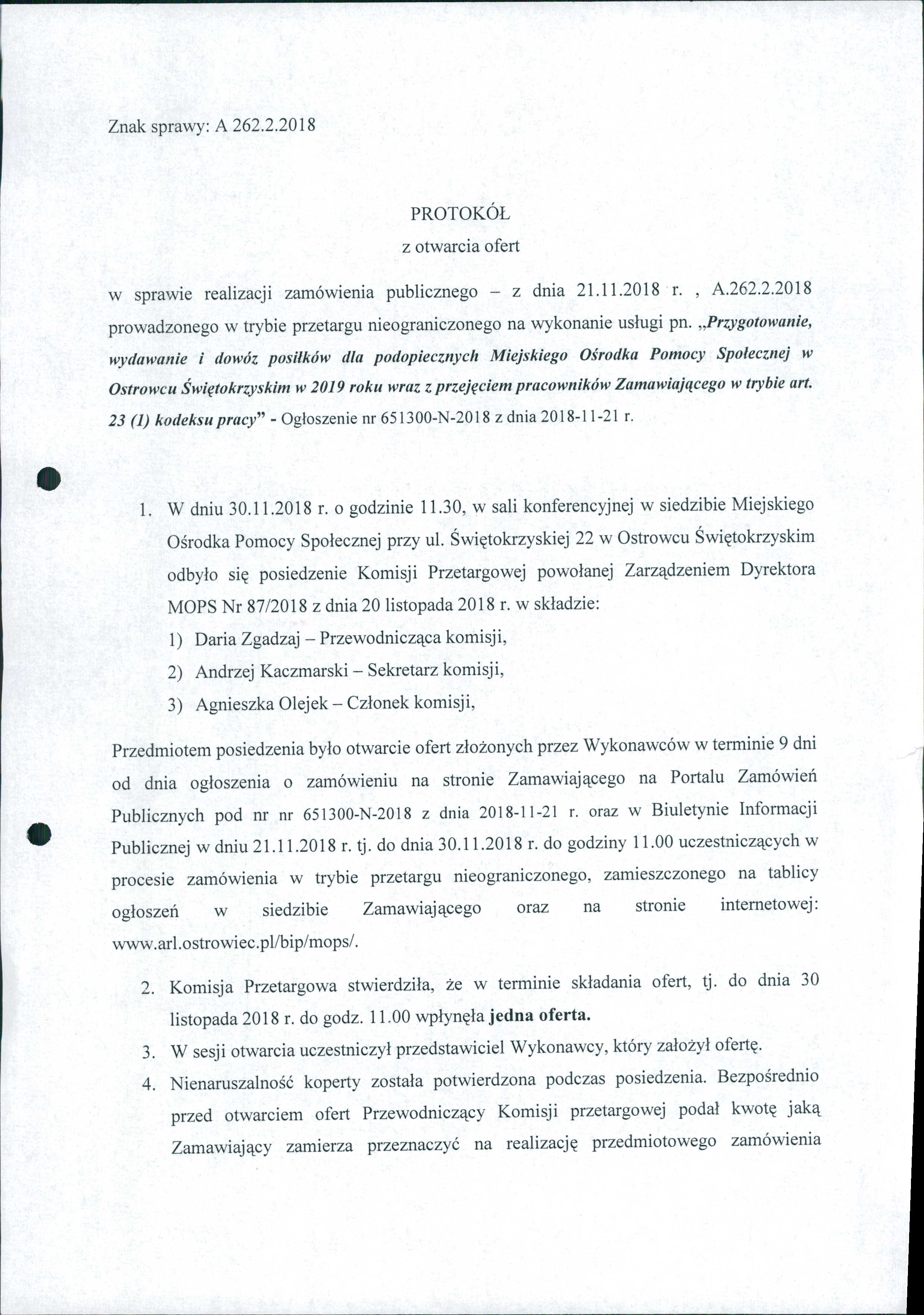 Protokół z otwarcia ofert - Przygotowanie, wydawanie i dowóz posiłków dla podopiecznych Miejskiego Ośrodka Pomocy Społecznej w Ostrowcu Świętokrzyskim w 2019 roku wraz z przejęciem pracowników Zamawiającego w trybie art. 23 (1) kodeksu pracy
